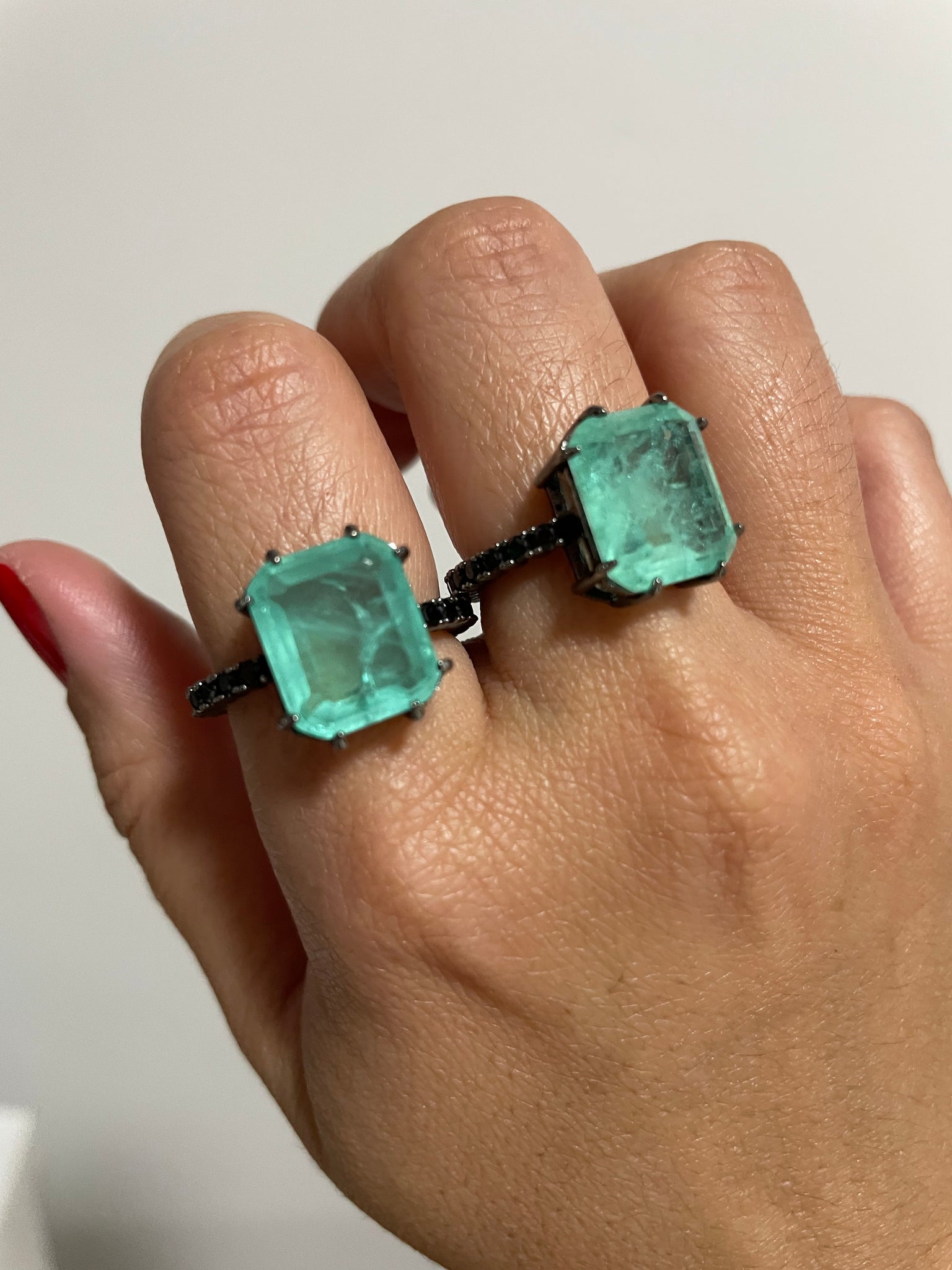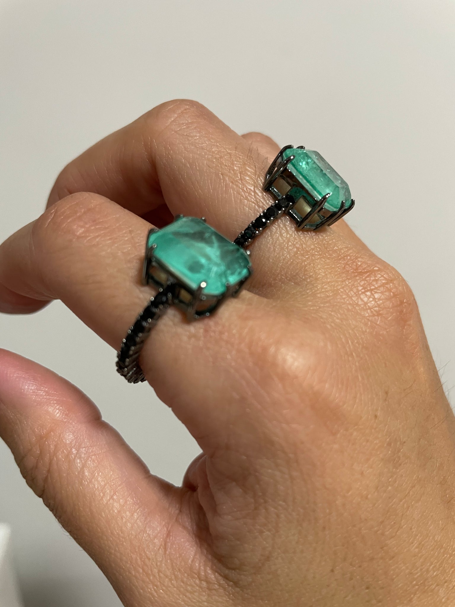 Anel em prata925 com esmeralda colombiana em fusion e banho de ródio negro com zirconias negras no aro