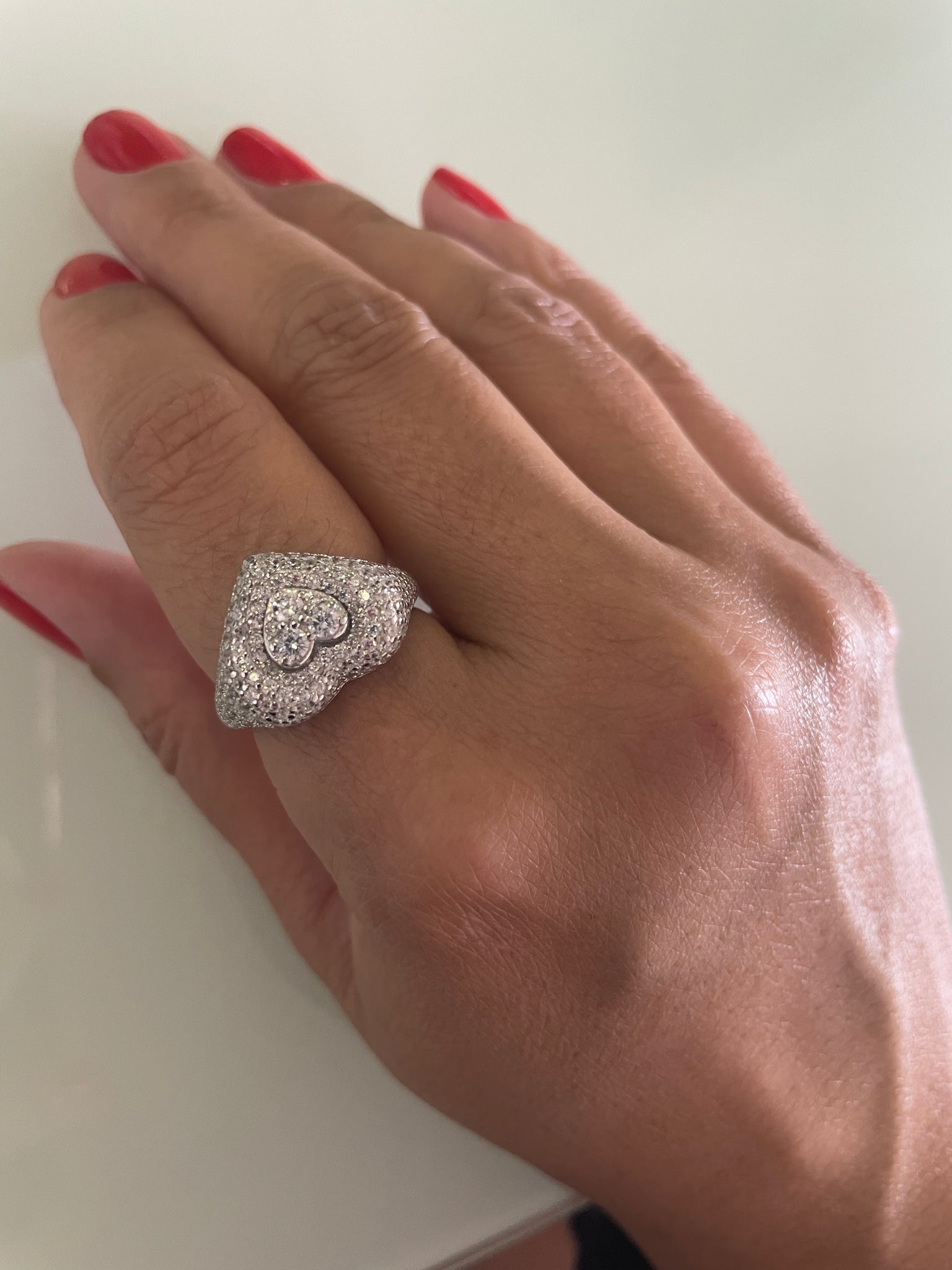 Anel coração com miolo em coração em prata925 com zirconias e banho de ródio branco