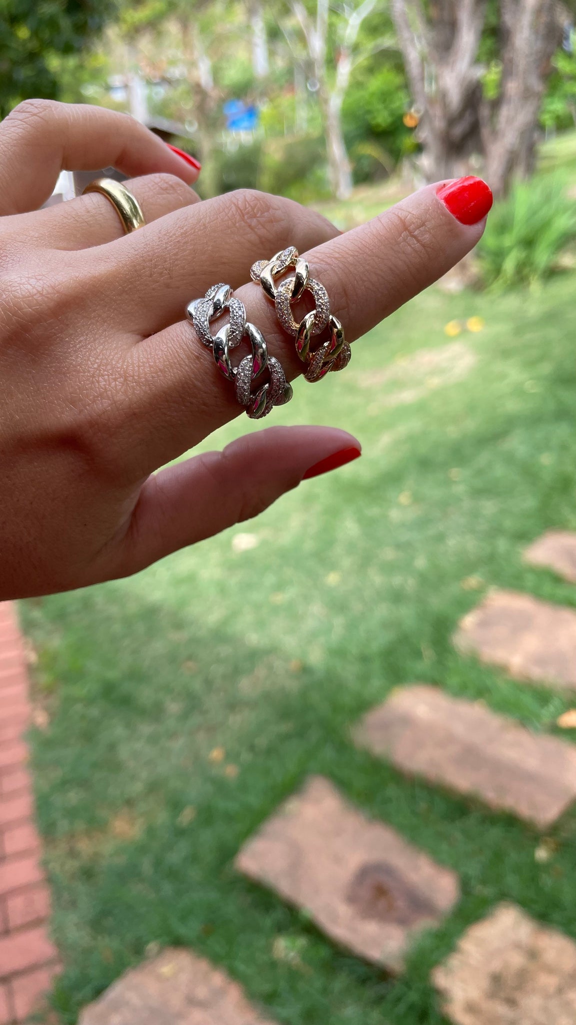 Anel elos em prata925 com zirconias e banho de ródio branco e Ouro18k