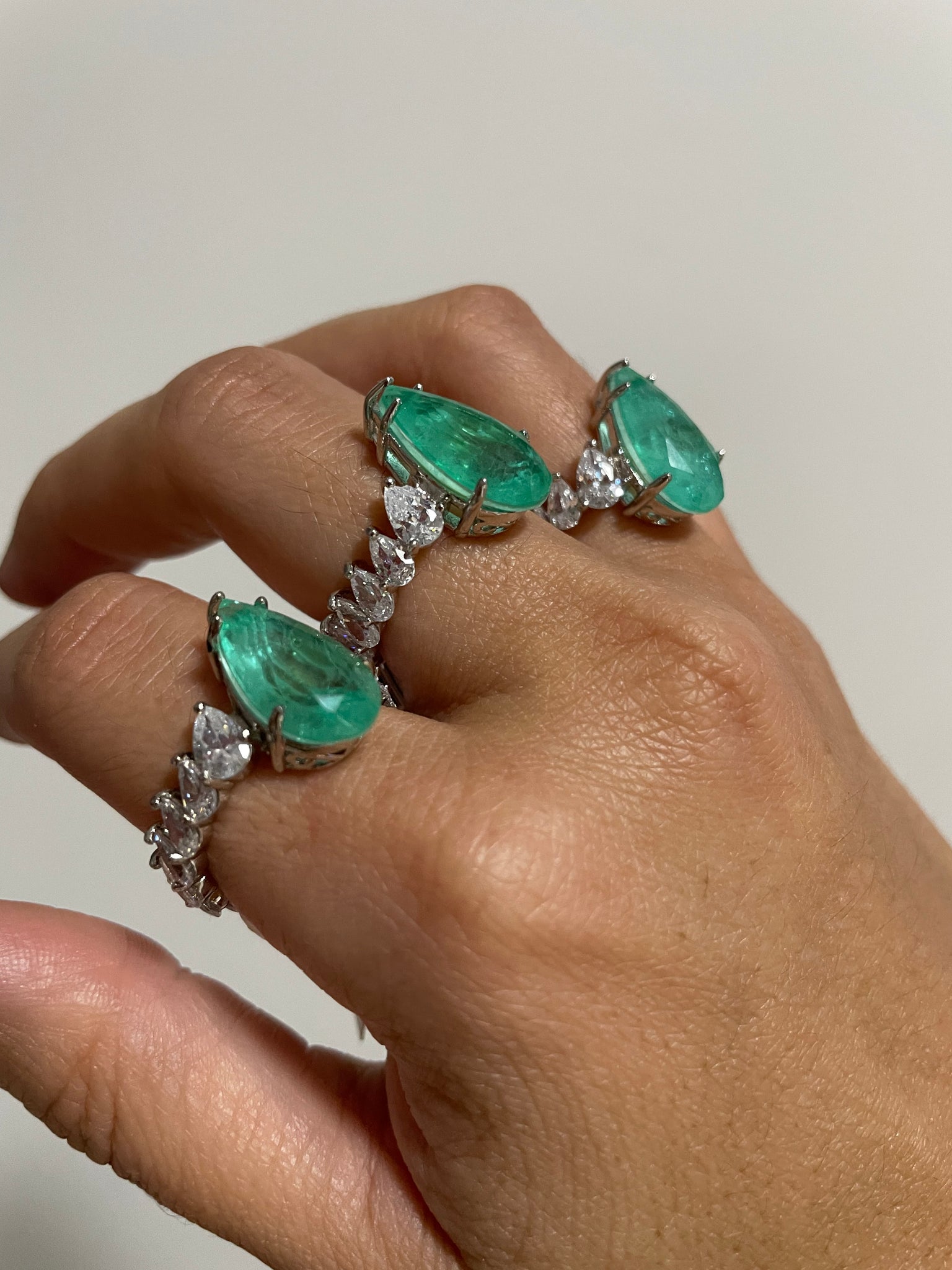 Anel semijoia gota esmeralda colombiana fusion aro riviera e banho de ródio branco