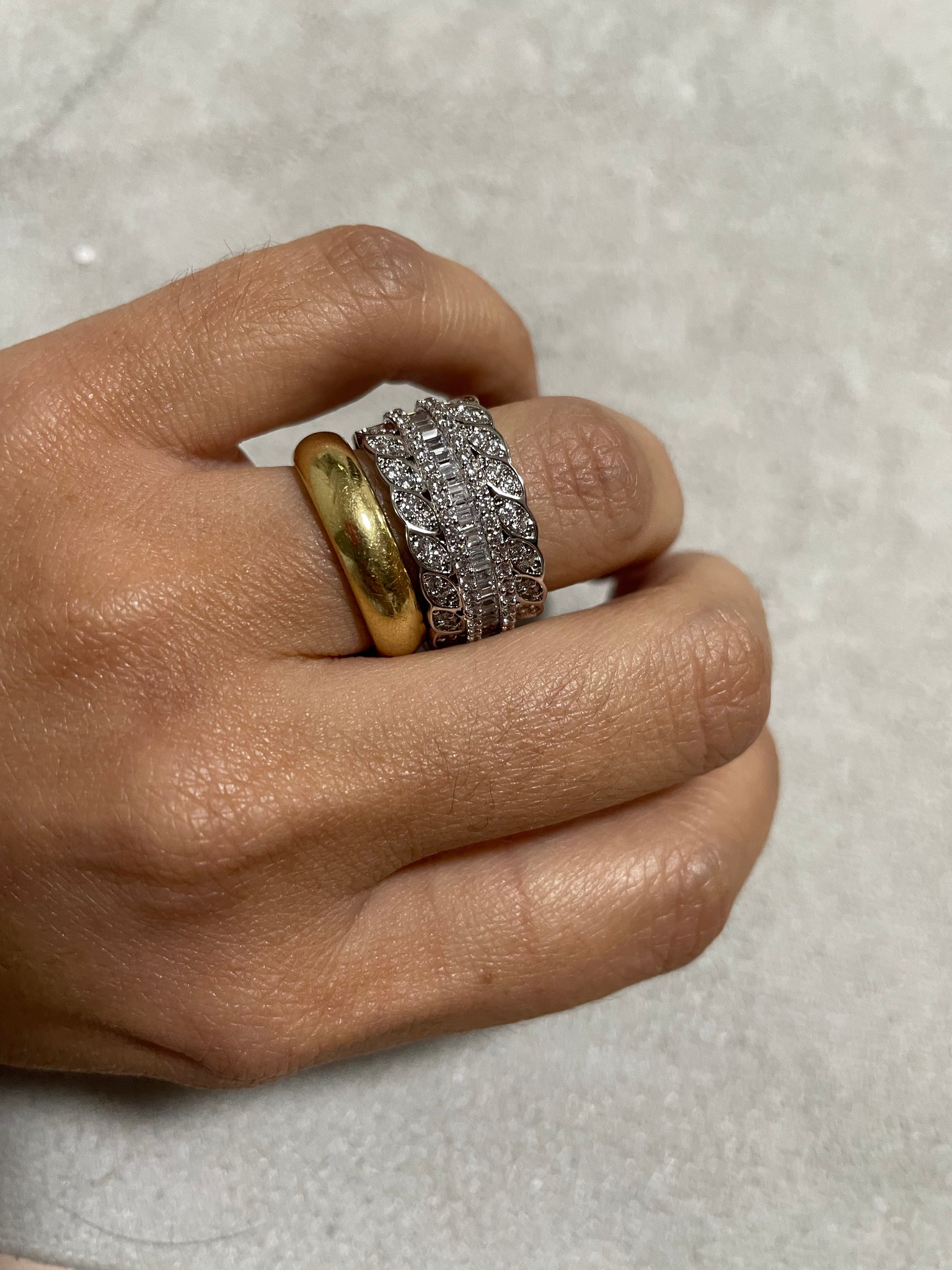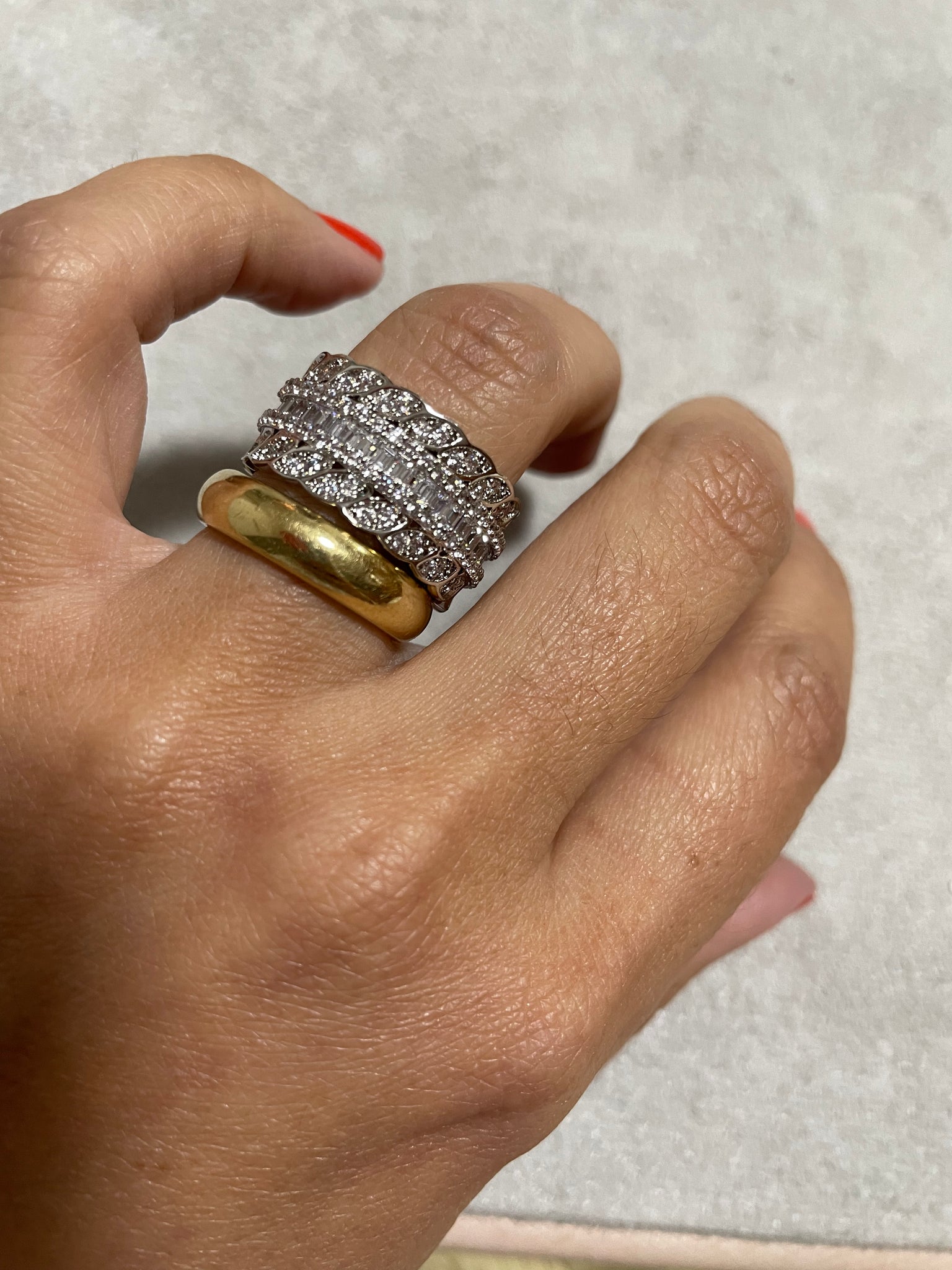 Anel em prata925 com fileira de baguete e detalhes folha nas extremidades com banho de ródio branco