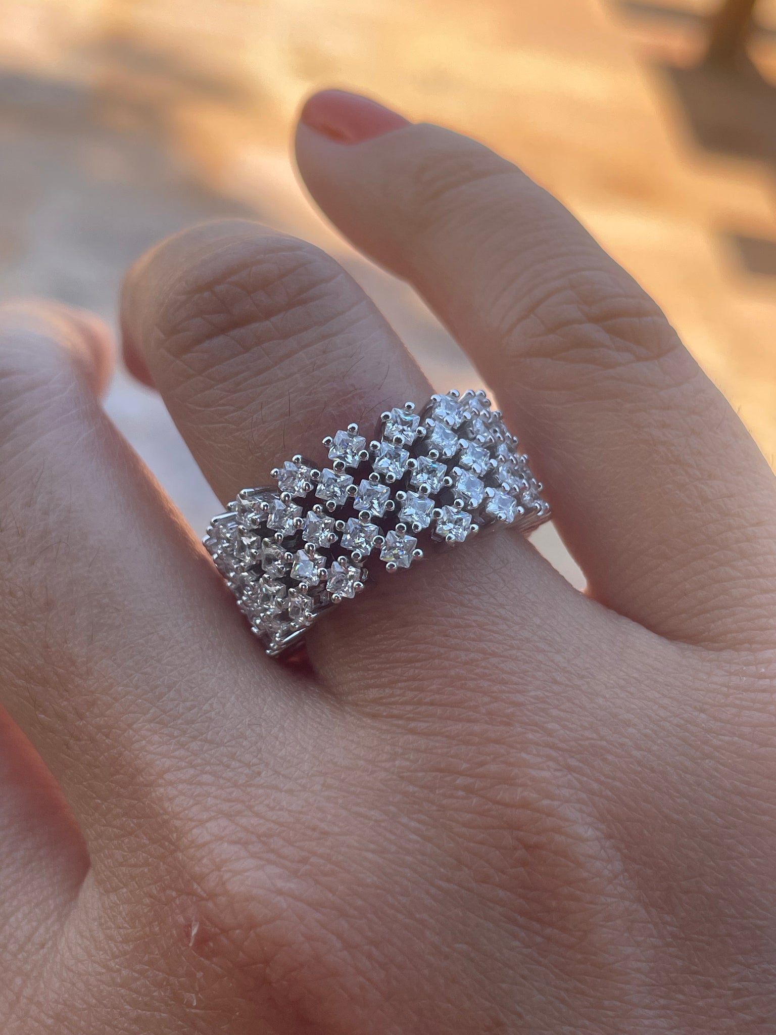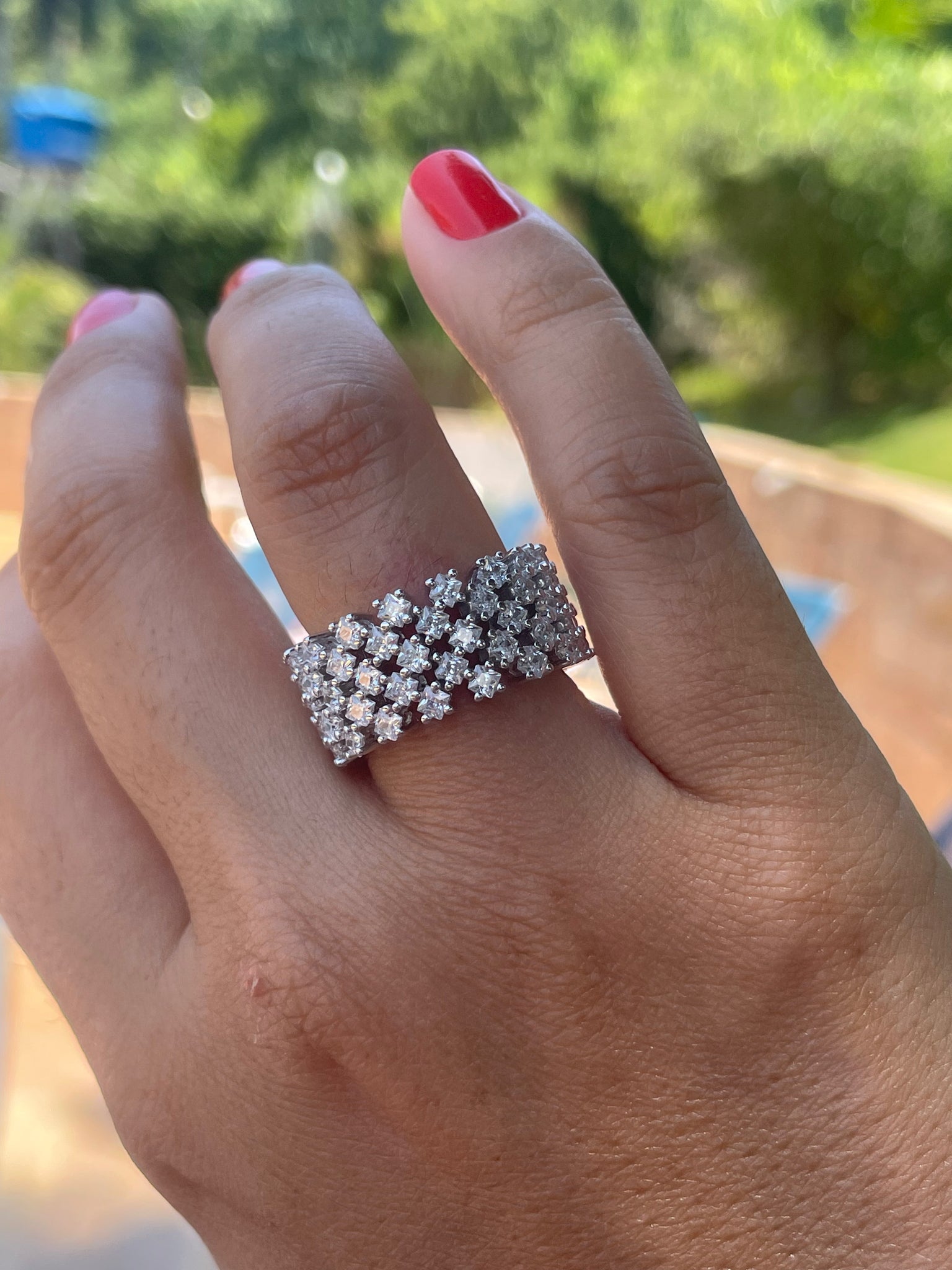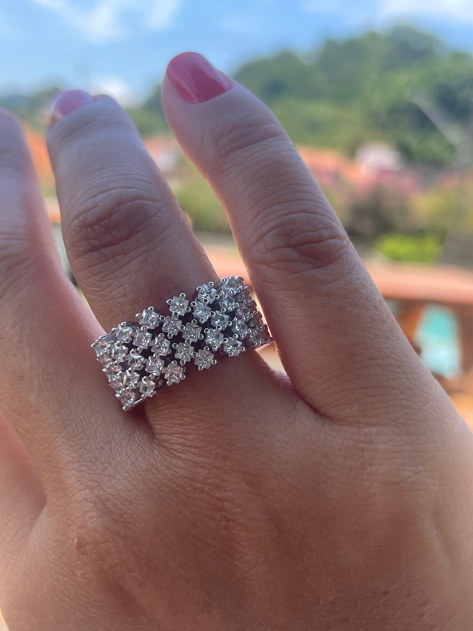 Anel malha maleável com 5 fileiras de zircônias em prata925 com banho de ouro branco