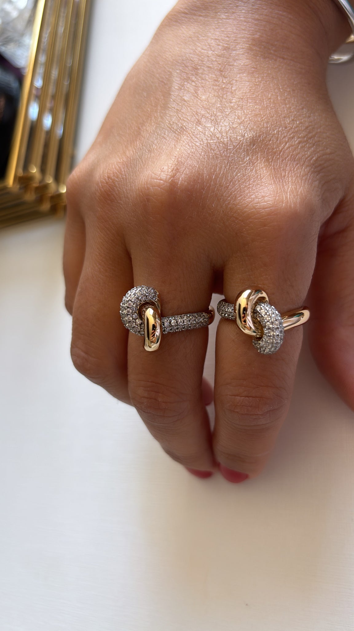 Anel nó em prata925 polido com detalhes cravejados em zirconias no banho de Ouro18k