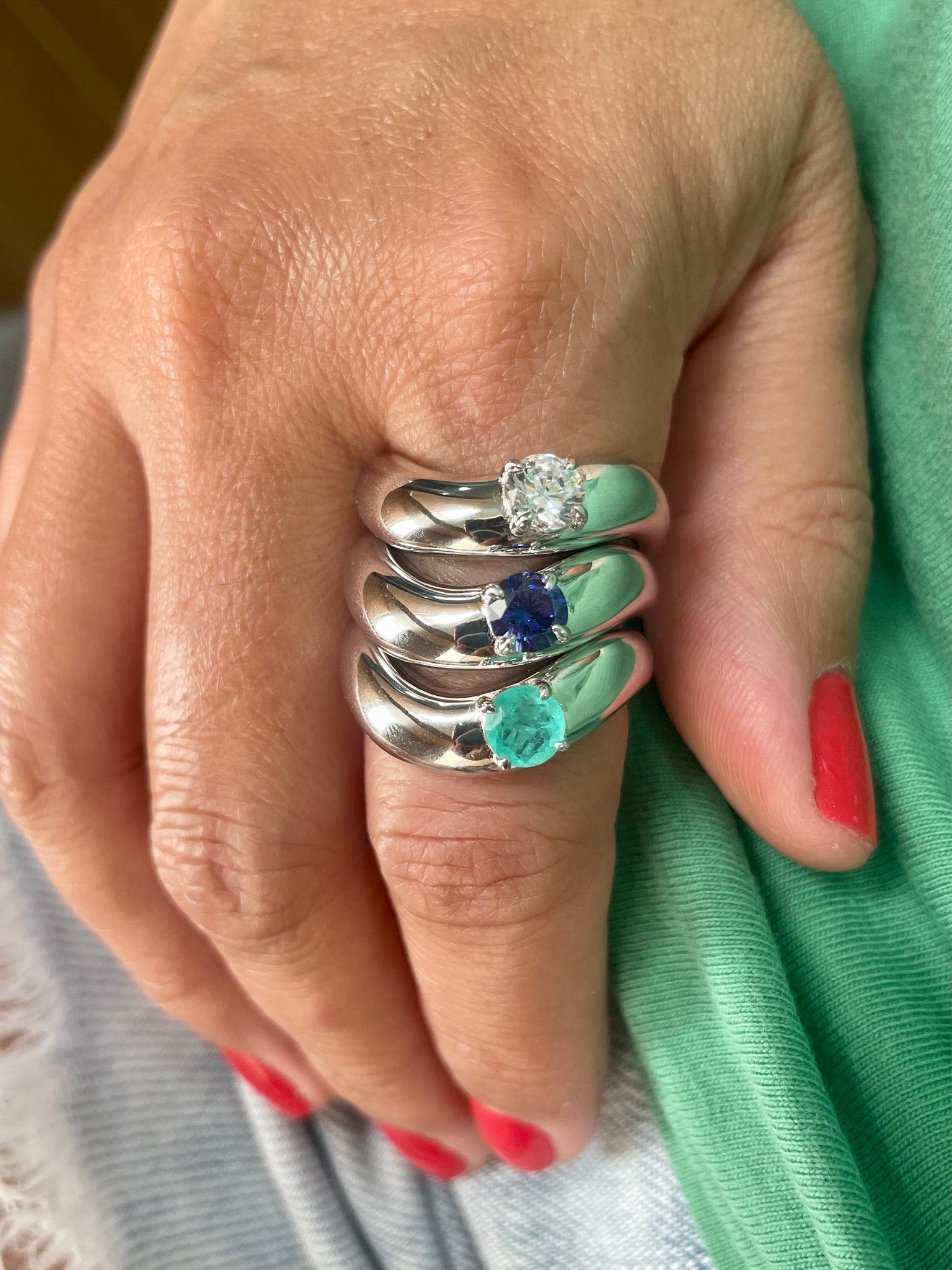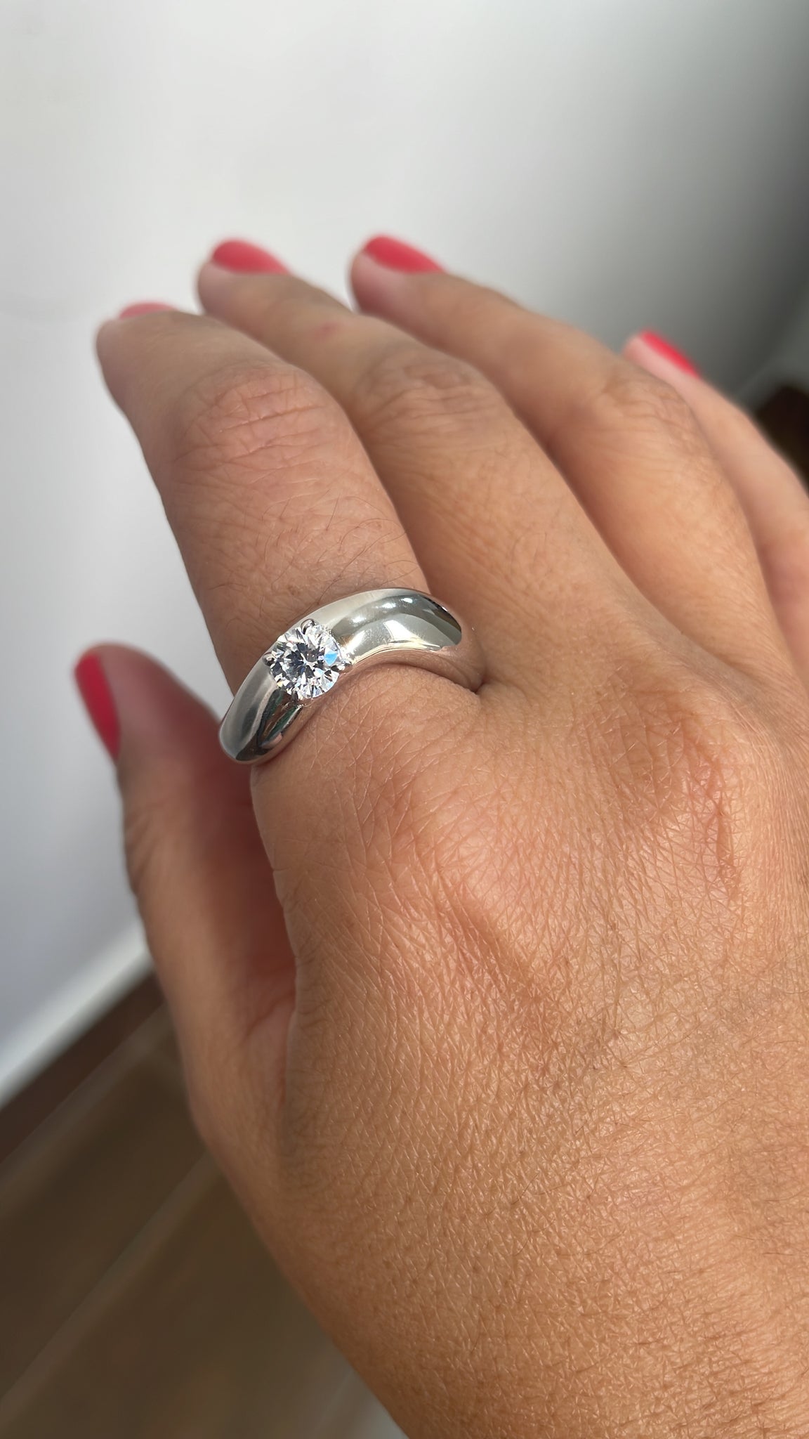 Anel onda polido com uma pedra em prata925 com banho de ródio branco