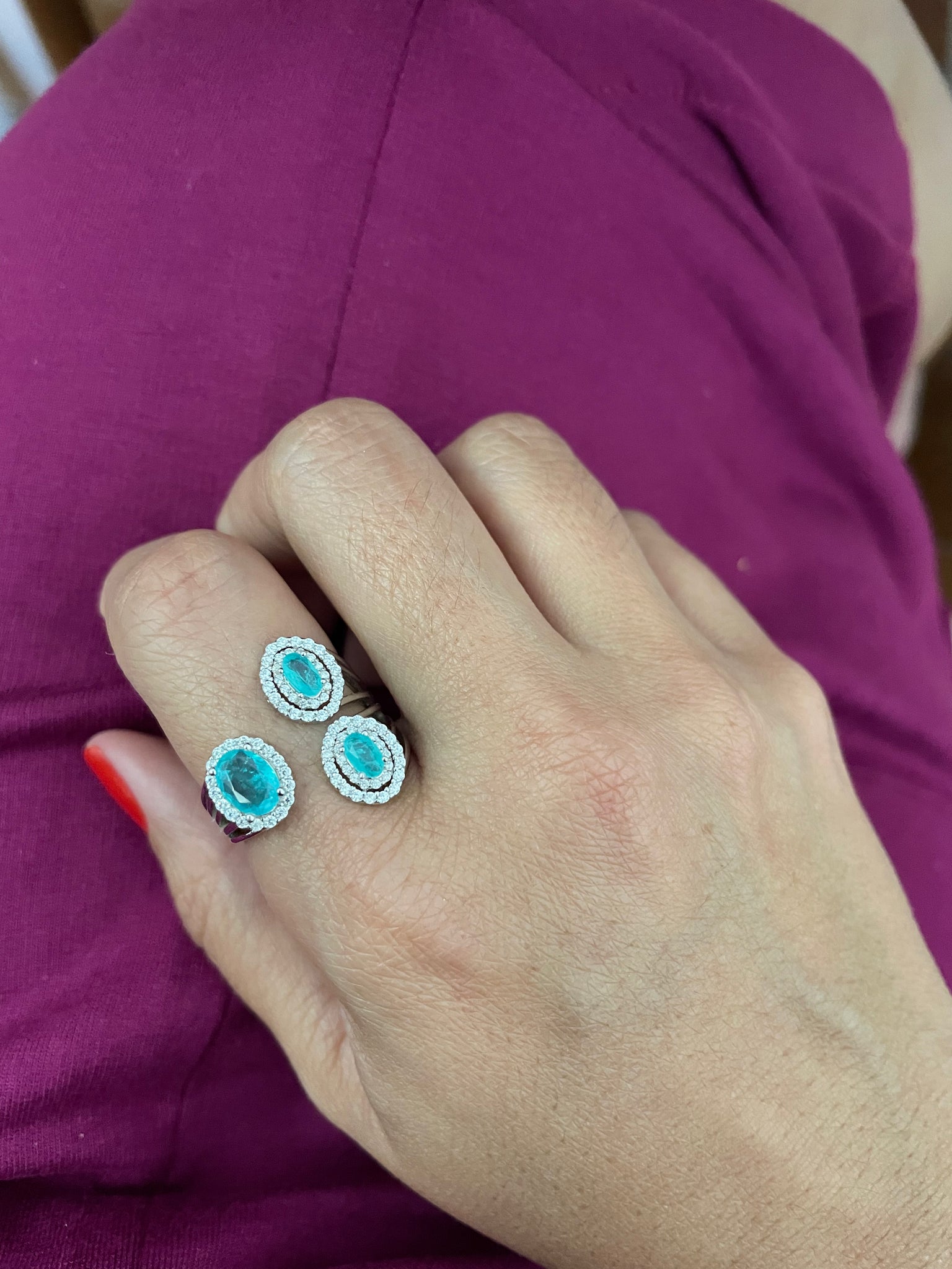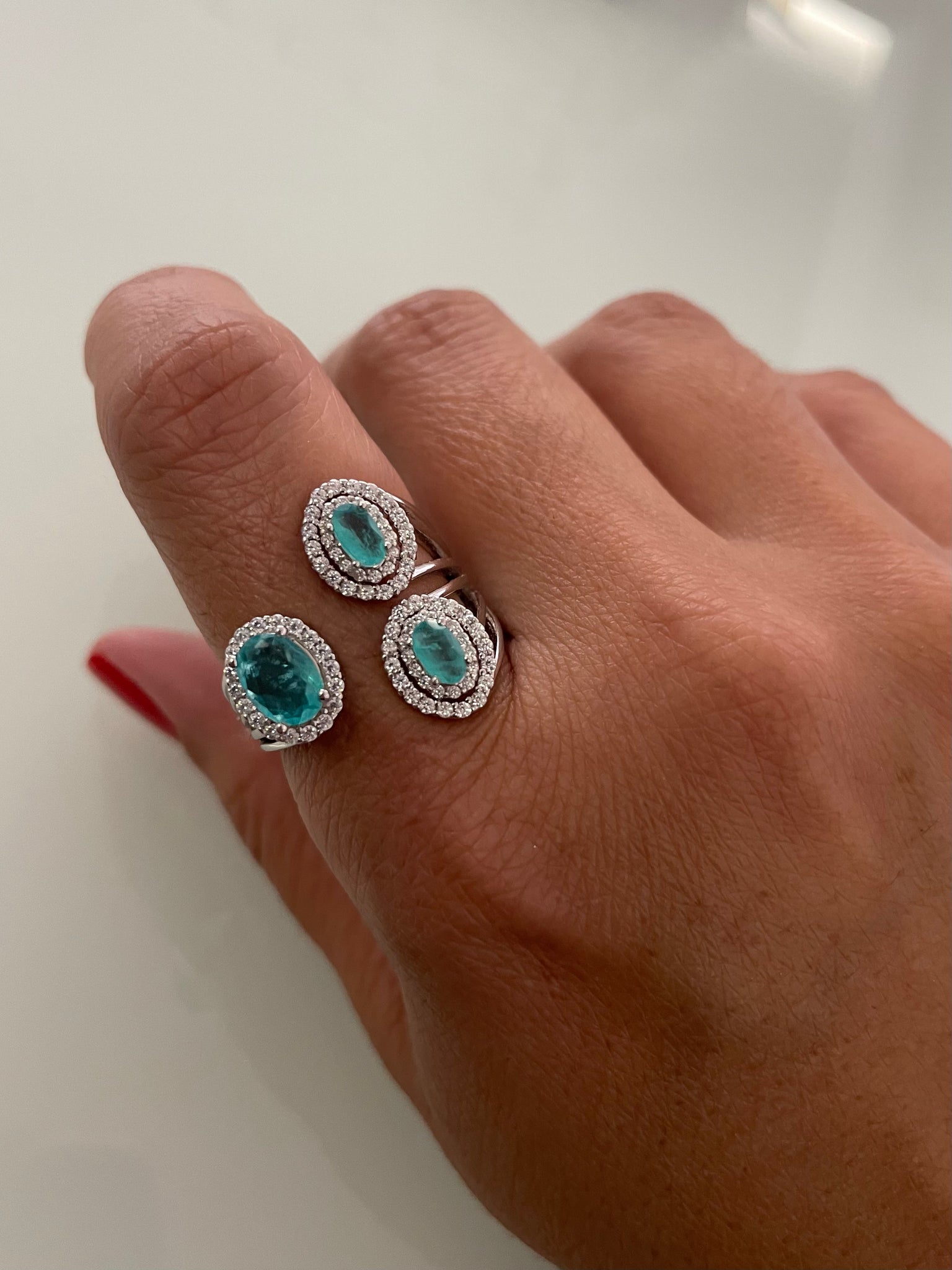 Anel aberto 3 pedras ovais fusion em prata925 com banho de ródio branco