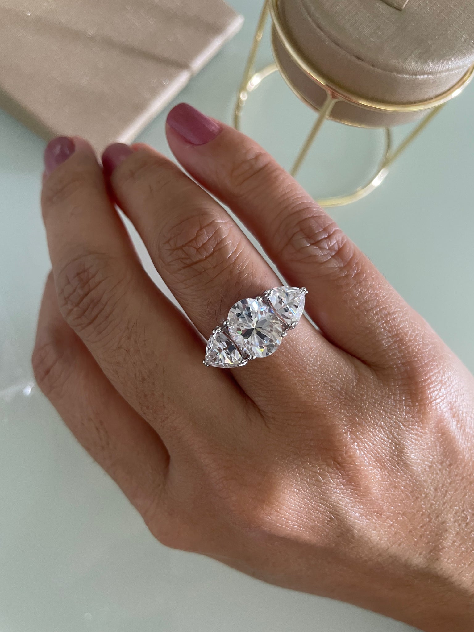 Anel com pedra central oval 8x6mm e laterais trillion de 4mm feito em moissanite, classificação VVS1 D branca em prata925 com banho de ródio branco.