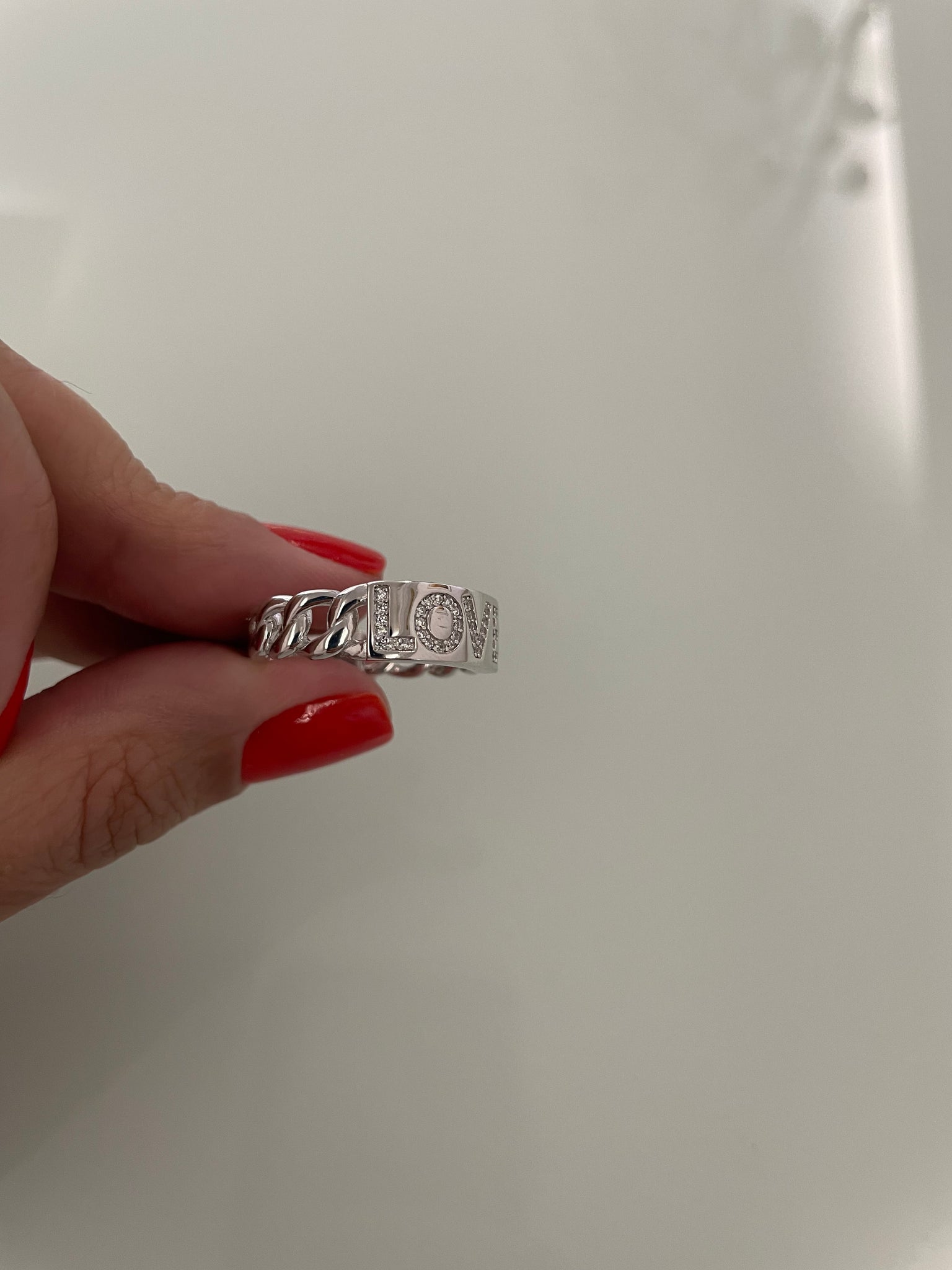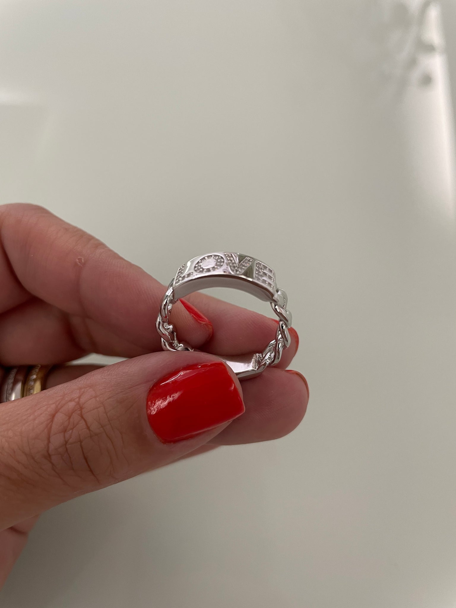 Anel placa love com zirconias e aro de corrente em prata925 com banho de ródio branco
