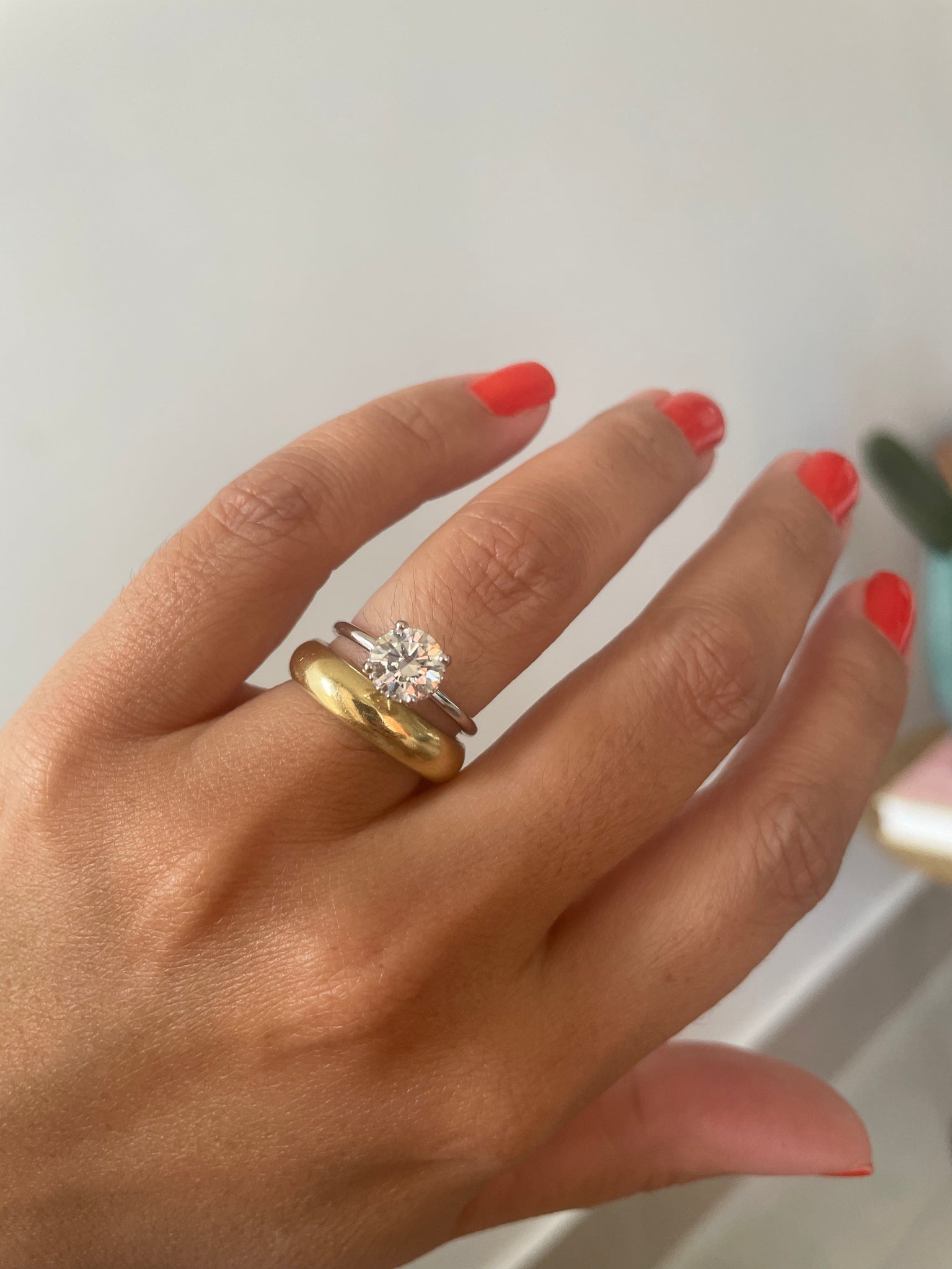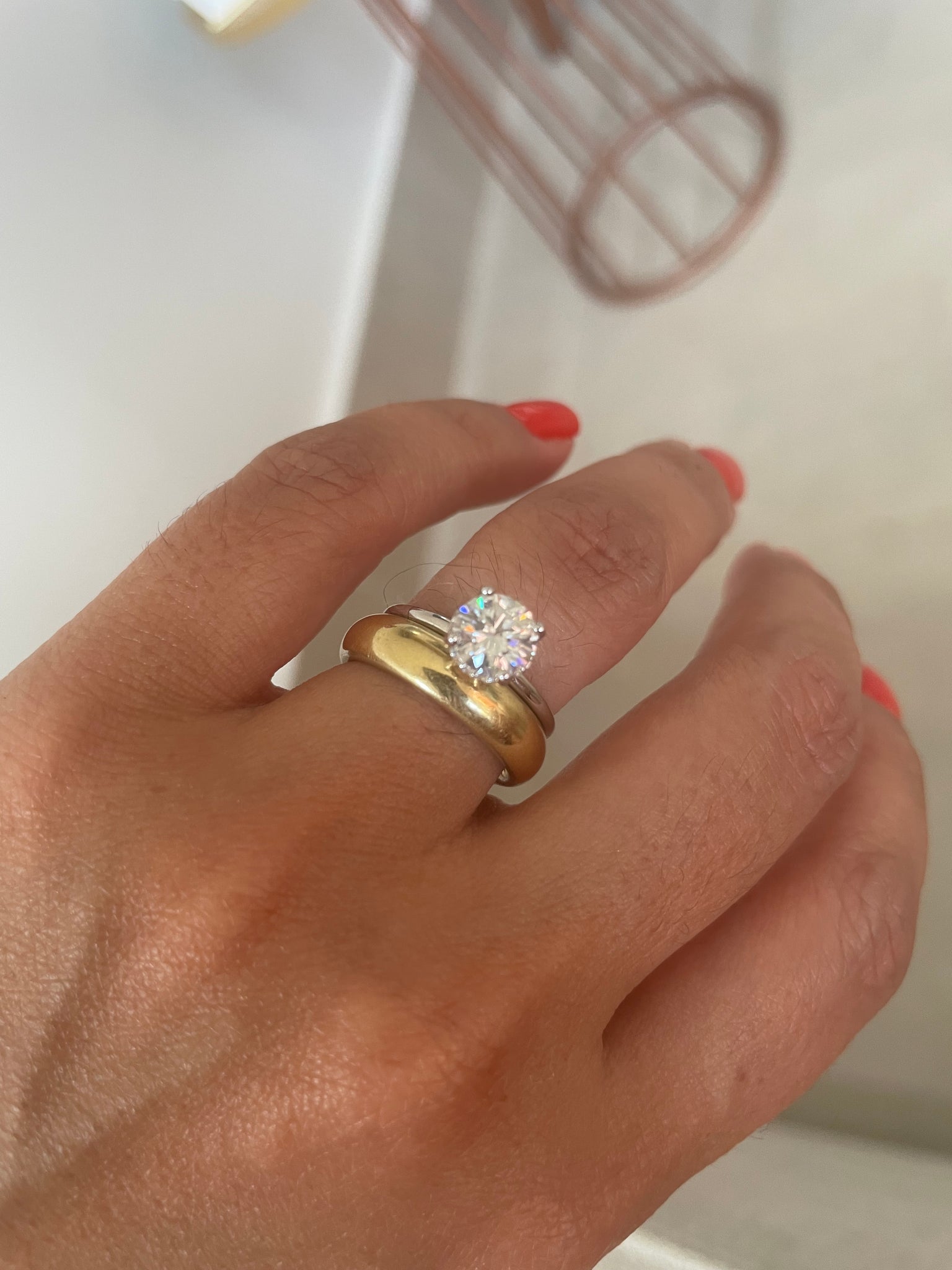Anel solitário com a pedra round em moissanite com 6mm - 1.25ct e mini moissanites em volta com 4 garras - cor D no banho de ródio branco