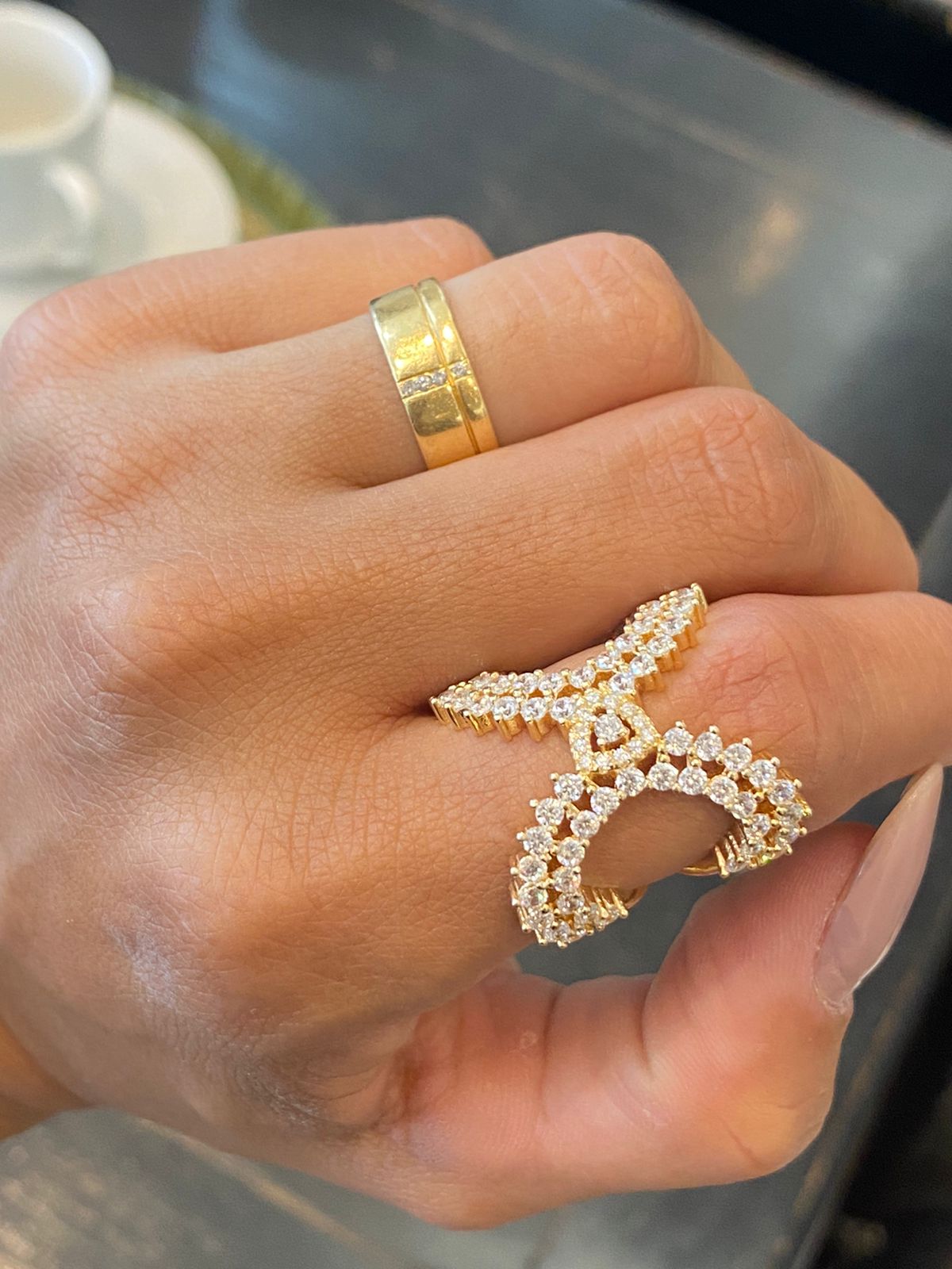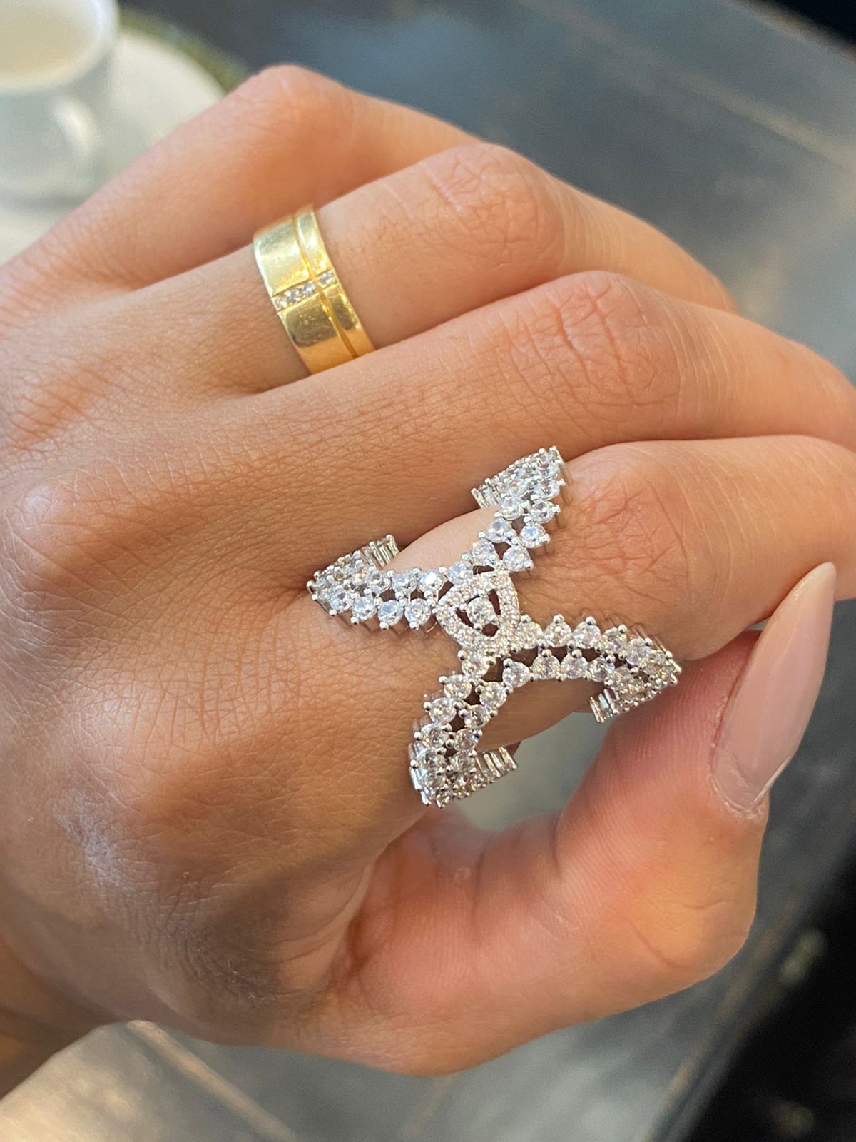 Anel tipo x em prata925 com zirconias e banho de ródio branco e ouro