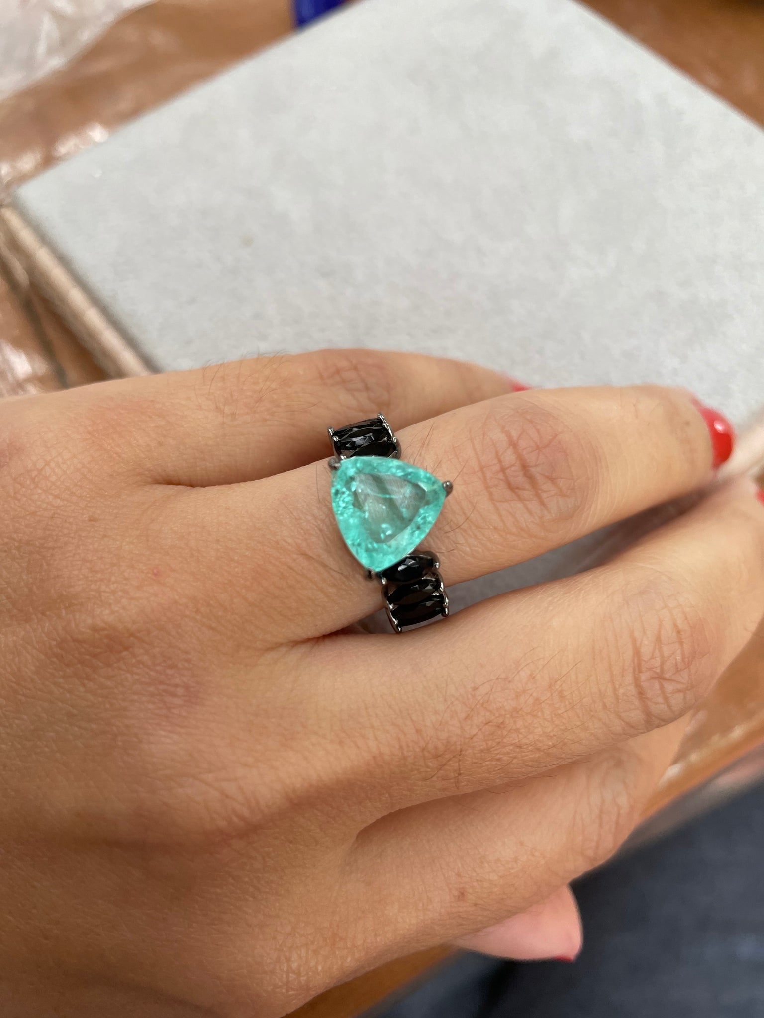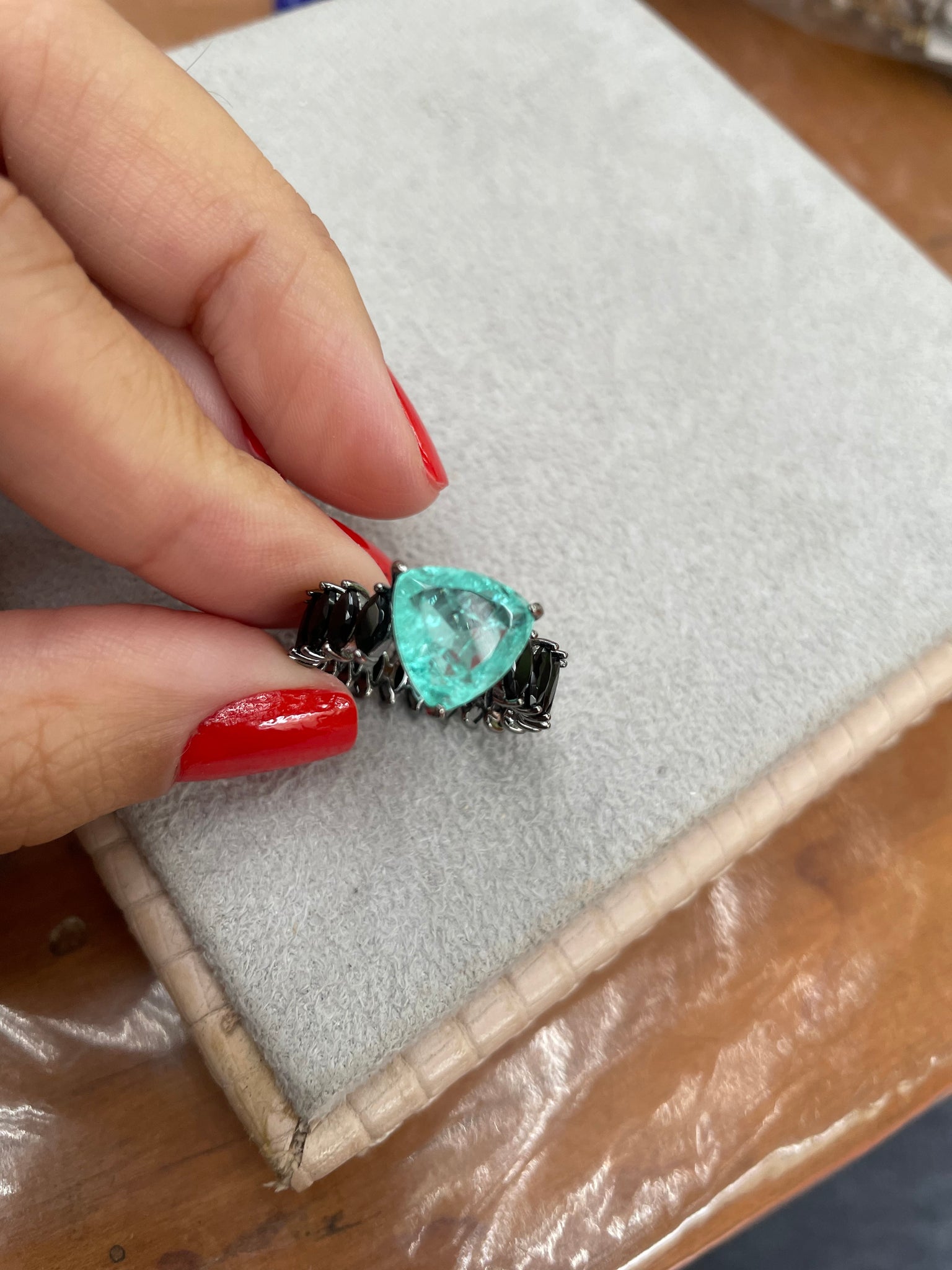 Anel esmeralda colombiana triângulo e aro com navetes negras em prata925 com banho de ródio negro