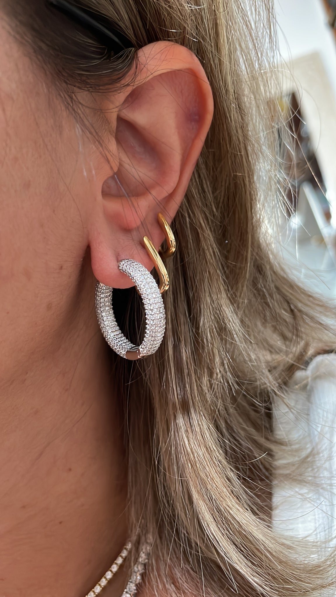 Argola abaulada em prata925 com zirconias e banho de ródio branco com 2cm de circunferência