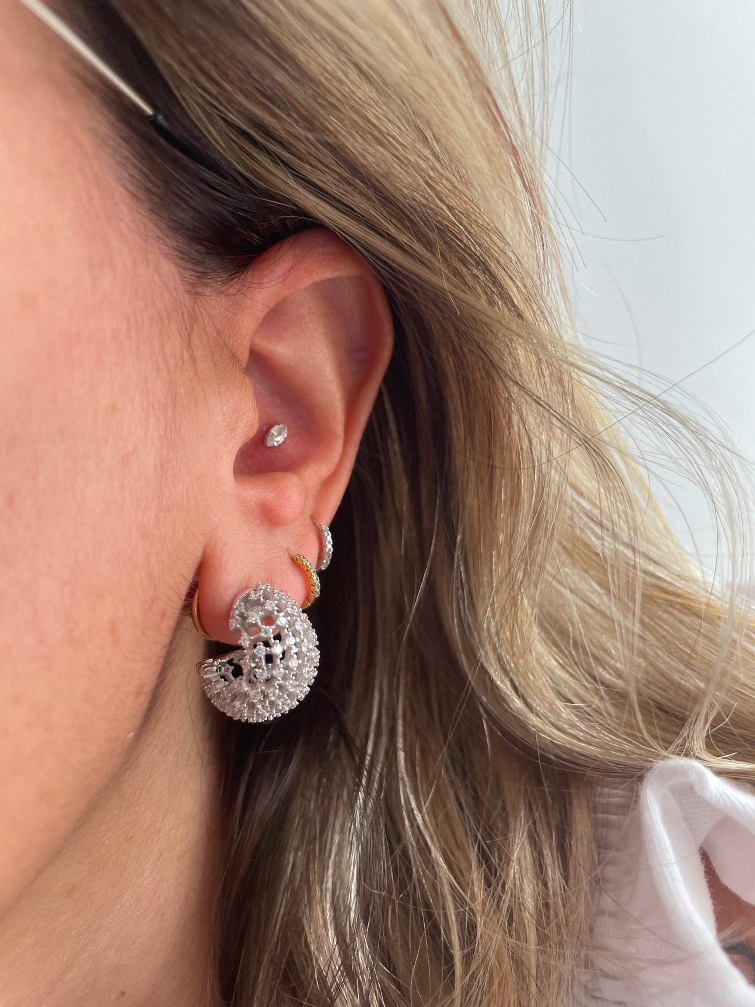 Argola abaulada aberta com zirconias e banho de ródio branco
